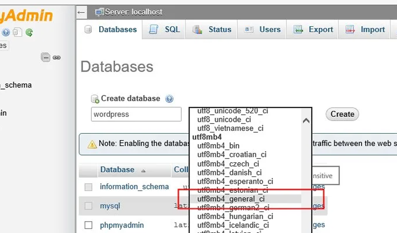Chọn collation: utf8mb4_general_ci